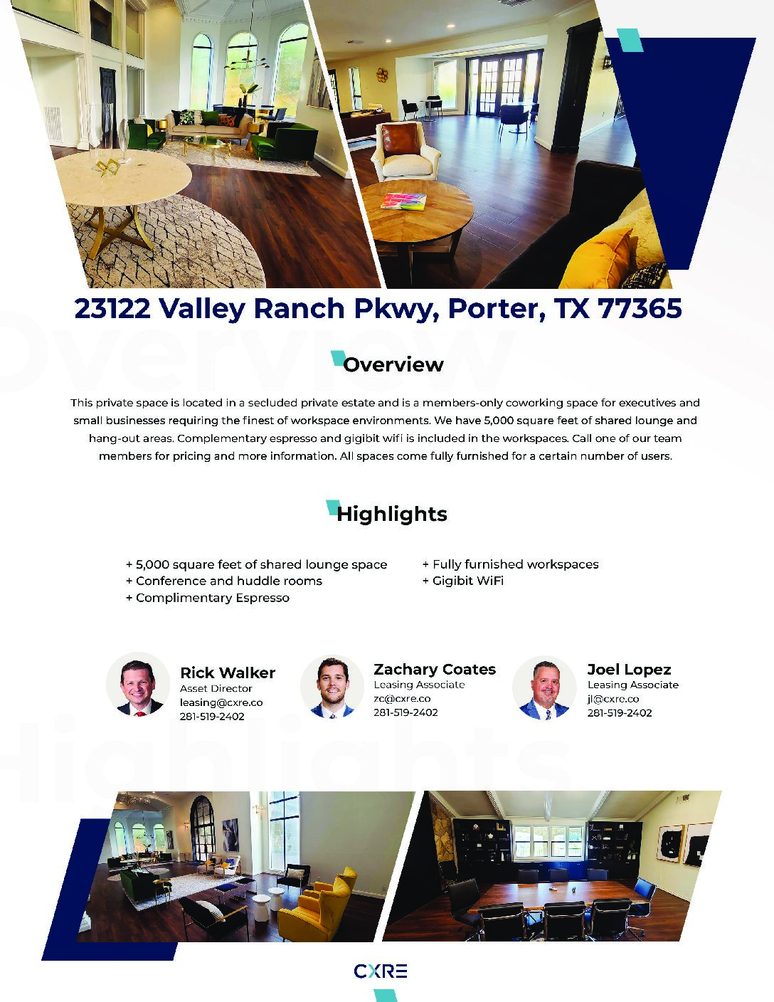 Signature amenities including an espresso café, Peloton room, podcast studio, and elegant meeting rooms for board-level conversations.